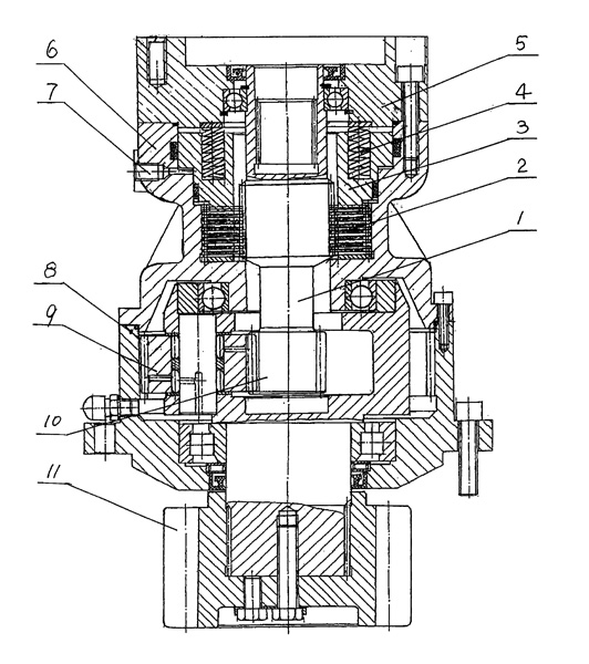 | 一種回轉(zhuǎn)減速機,在殼體內(nèi)有常閉摩擦制動機構(gòu)和行星減速機構(gòu),殼體包括馬達座、油缸體、摩擦片座、行星輪架軸承座和內(nèi)齒殼體座等部分,其特征是其中油缸體、摩擦片座和行星輪架軸承座三部分為一件零件。 |