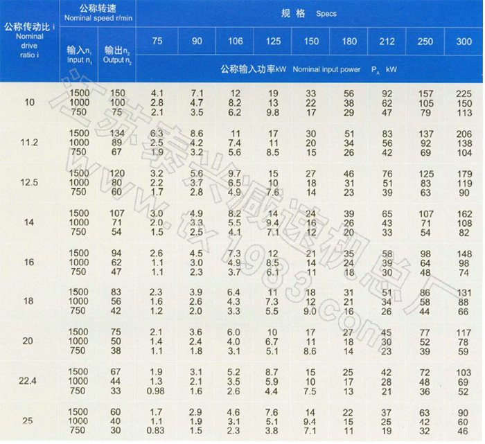 212、250、300九種規(guī)格。每一規(guī)格的傳動(dòng)比有10、11.2、12.5、14、16、18、20、22.4、25九種。