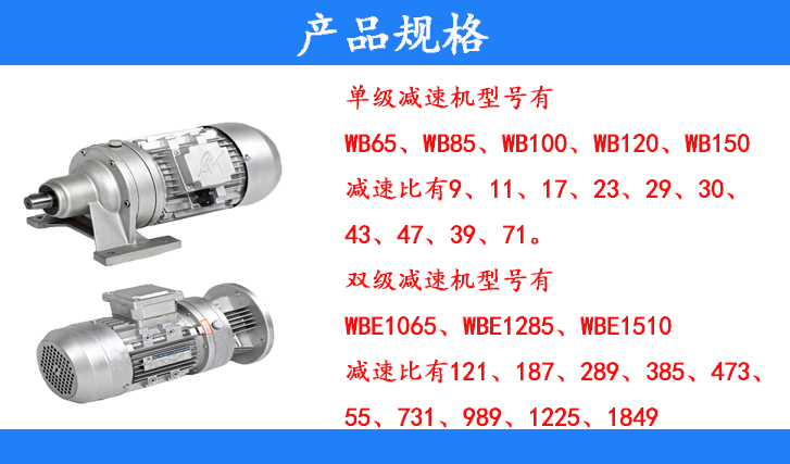 A、WB系單級(jí)減速機(jī)型號(hào)有:WB65、WB85、WB100、WB120、WB150